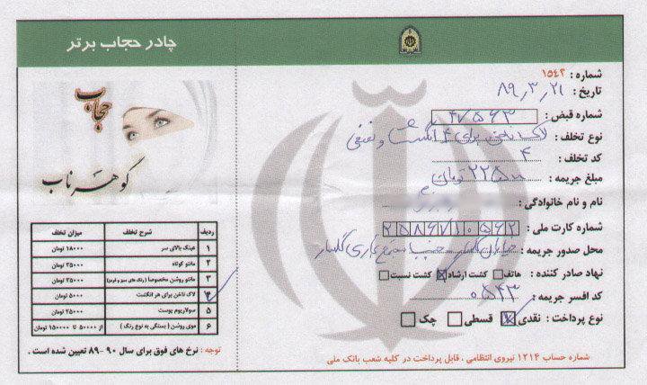 Une autre autorité, le colonnel Massoud Zahedian, commandant de la « Police de la sûreté morale » a déclaré : les forces de sécurité scrutent la voie publique avec des cameras pour « vérifier la voile des femmes. » Il existe différents types de patrouilles de police pour imposer la voile aux femmes. Zahedian a révélé que 27 institutions ont mandat de contrôler le hidjab. Les agents mandatés dans la rue établissent des contraventions pour les femmes ne respectant pas les normes de la voile obligatoire selon une grille réglementée. En voici un exemple :