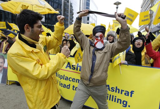 Reuters, 1 décembre – Des Iraniens en exil manifestent devant le siège du Conseil européen en défense du camp d’Achraf à Bruxelles le 1 décembre 2011. L’Union européenne a exhorté l’Irak le 22 novembre à donner du temps aux Nations Unies pour déterminer le statut des habitants d’un camp d’opposants iraniens que Bagdad a menacés de déportation à la fin de l’année.