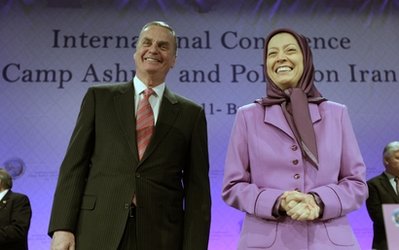 AP – Maryam Radjavi, à droite, présidente-élue du parti de l’opposition iranienne le Conseil national de la Résistance iranienne, et le général américain et conseiller à la sécurité nationale des Etats-Unis James Jones, souriant à une conférence internationale sur la politique iranienne à Bruxelles, mardi 25 janvier 2011. (AP Photo/Yves Logghe)