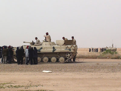 Dans un acte extrêmement hostile sur les ordres du Premier ministre irakien Nouri al-Maliki, les forces armées irakiennes sont entrées de nuit dans le camp avec au moins 30 transports de troupes blindés BMP et Humvee. Ils ont pris position dans une formation hostile.