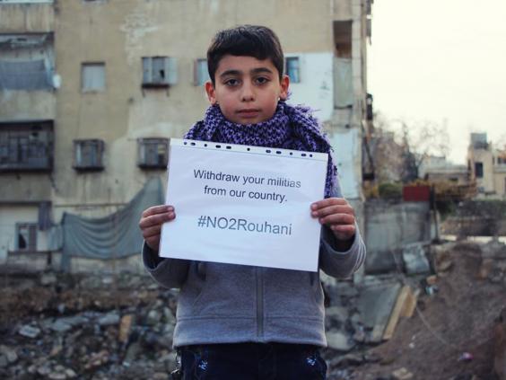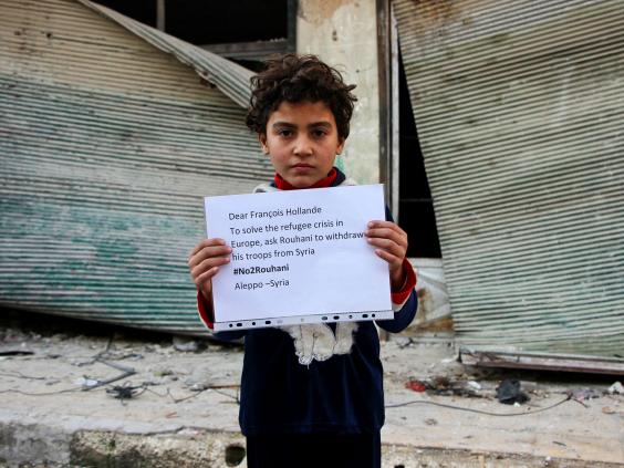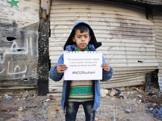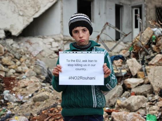 Independent – Alors que le président iranien poursuit son importante visite en Europe, des enfants syriens ont été photographiés avec des affiches demandant aux dirigeants de s’opposer à son intervention présumée dans la guerre civile du pays.