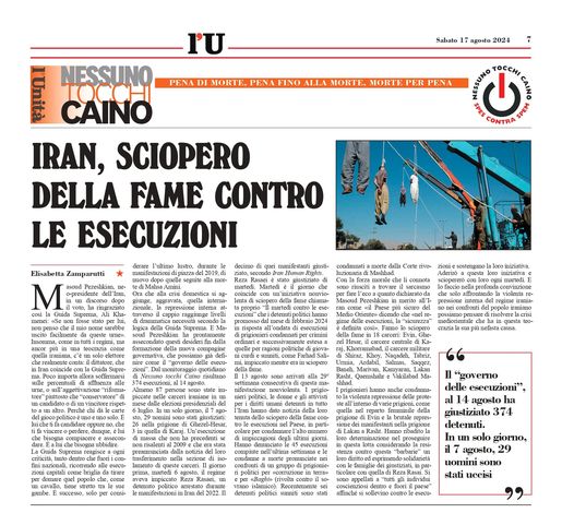 Elisabetta Zamparutti, ancienne députée italienne et responsable de l’organisation de défense des droits de l’homme « Hands Off Cain », a annoncé le 19 août sa solidarité avec la campagne « Non aux exécutions le mardi ». Elle a déclaré sur ses comptes Facebook et Instagram que le nombre d’exécutions en Iran augmente continuellement et de manière spectaculaire et que rien ne change en Iran sous le règne du Guide suprême, quel que soit le président. Par conséquent, elle s’est engagée à se joindre à la grève de la faim chaque mardi aux côtés des prisonniers iraniens pour protester contre les exécutions.