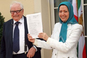 A l’issue du non-lieu, Me Henri Leclerc, président d’honneur de la Ligue des Droits de l’homme, félicite Maryam Radjavi, élue présidente de la République pour la période de transition par le Conseil national de la résistance iranienne.