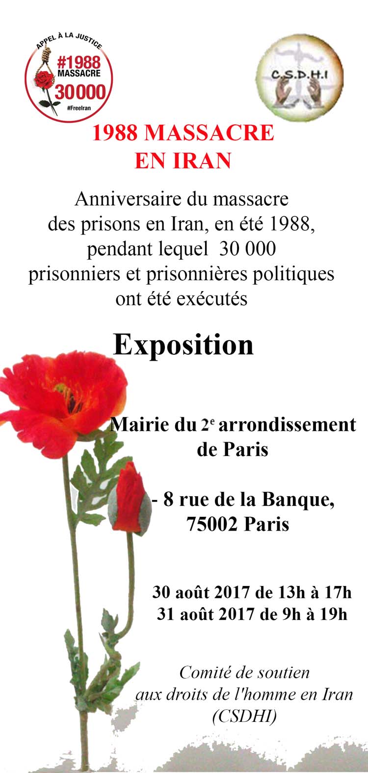 À l’occasion de l’anniversaire du massacre de 30 000 prisonniers politiques en 1988 en Iran, les mois de juillet, août et septembre sont marqué par cette tragédie. A cette occasion une exposition sera organisée les 30 et 31 août à la mairie du 2ième arrondissement de Paris. Elle comprendra une exposition de photos, de documents sur le thème de ce crime contre l’humanité resté impuni.