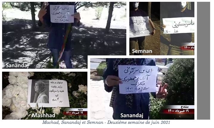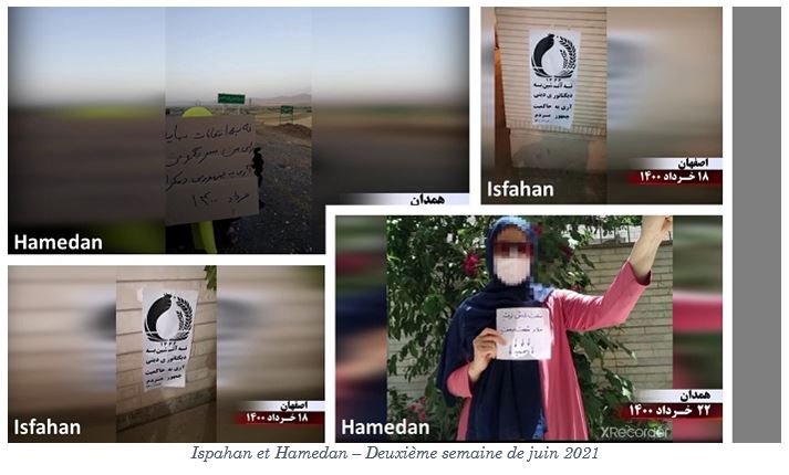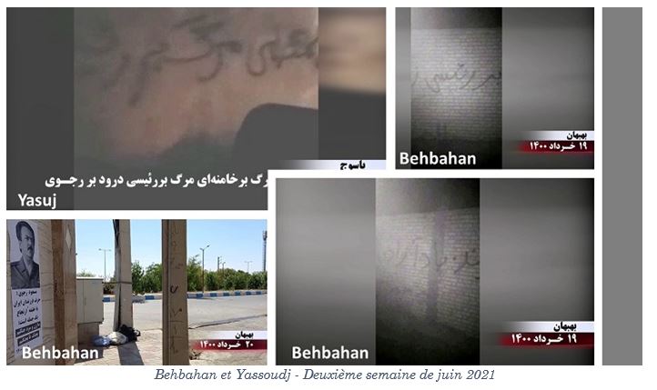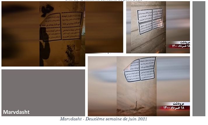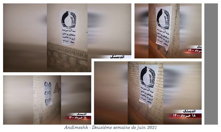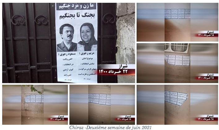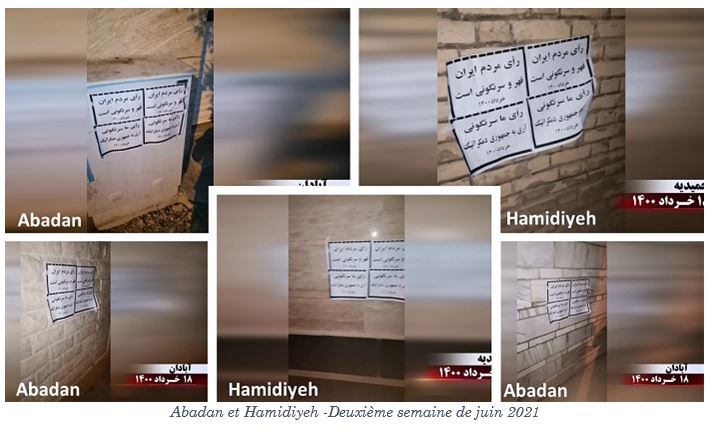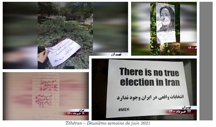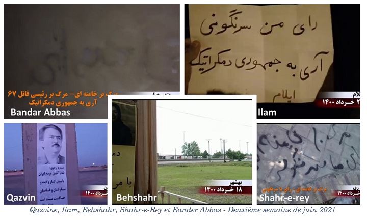 Parmi les slogans sur les pancartes et sur les murs figuraient : « Maryam Radjavi : le boycott de la farce électorale est un devoir patriotique », « Maryam Radjavi : l’objectif principal de la farce électorale est de couvrir la répression, le meurtre et le pillage », « Massoud Radjavi : Le destin de l’Iran ne sera pas déterminé par les urnes des mollahs, mais par le soulèvement des vaillants enfants de l’Iran, les insurgés remporteront la victoire », « Massoud Radjavi : Le soulèvement du peuple iranien mettra fin au règne des pilleurs et des usurpateurs de la souveraineté de la nation », « Massoud Radjavi : Le régime clérical est une vipère, il n’accouchera pas d’une colombe », « La nation n’a pas oublié que Raïssi est le bourreau du massacre de 1988 », « Non au simulacre d’élection du régime, oui à une élection libre et à une république démocratiquement élue », « Je vote pour le changement de régime, oui à une république démocratiquement élue, » « A bas Khamenei, à bas Raïssi, le bourreau du massacre de 1988, oui à une république démocratiquement élue, » « A bas Khamenei, à bas Raïssi, vive Radjavi, » « Nous sommes des femmes et des hommes de combats, venez vous battre et nous riposterons », « Démocratie, liberté avec Maryam Radjavi ».