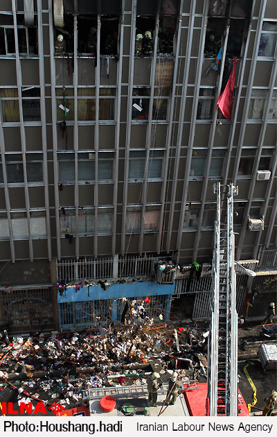 Cet incident a eu lieu le 19 janvier dans un centre d’affaires situé au cœur de la Capital iranienne. Lorsque l’incendie s’est propagé dans ce bâtiment comportant un nombre élevé d’étages, les issus de secours ont été bloqués. Deux femmes ouvrières qui se trouvaient dans le bâtiment incendié ont été contraintes d’en sortir par la fenêtre. Pendant un long moment, ces deux victimes se sont restées accrochées à la fenêtre. Mais à cause de l’arrivée tardive des services de secours et le dysfonctionnement d’équipements de secours les deux victimes n’ont pas pu être sauvées. Elles sont tombées en chute libre et sont mortes sur le champ.