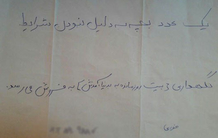 C’est la dernière tentative d’une femme enceinte qui a collé cette affiche faite à la main sur le mur de la rue Azadi à Téhéran. De l’autre côté, un nouveau-né a été abandonné dans la rue.