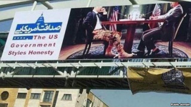 Dans une des images, on voit une main qui se tend pour en serrer une autre tandis qu’elle se transforme en la main du diable et dans une autre affiche davantage répandue à Téhéran, un homme accompagné d’un chien enragé est assis à la table des négociations.