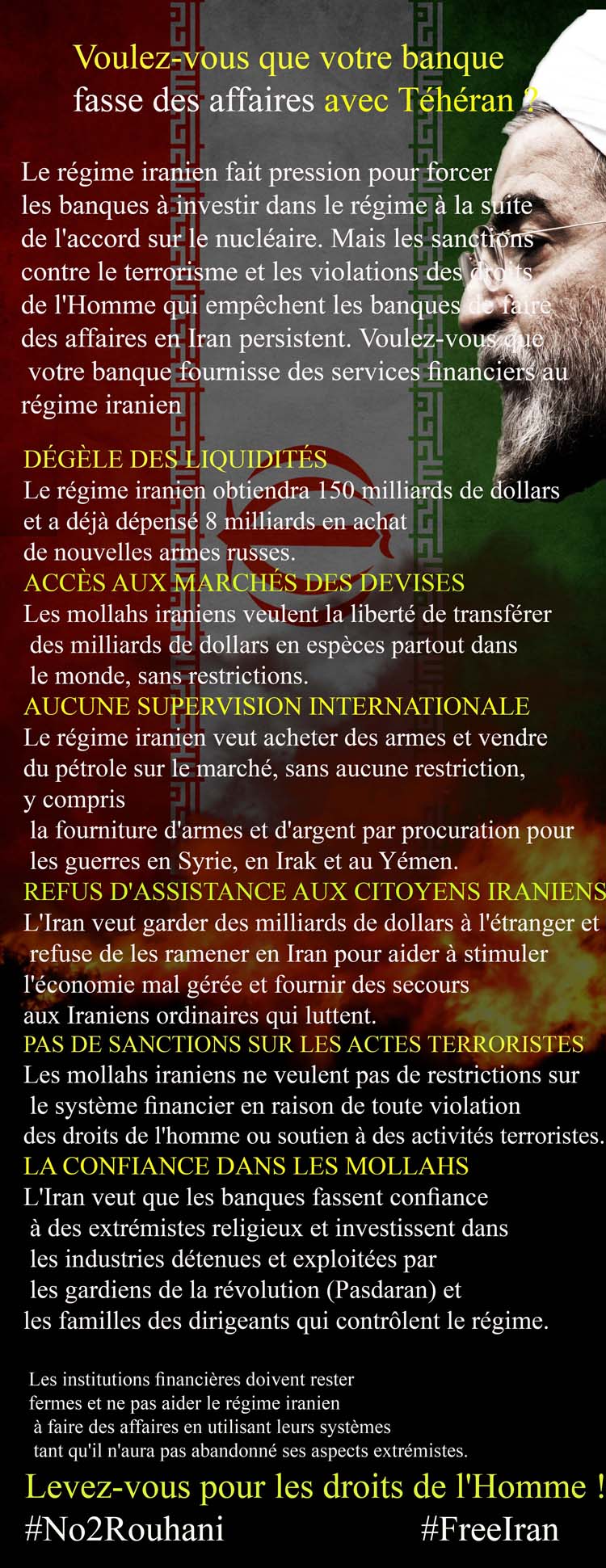 Le régime iranien fait pression pour forcer les banques à investir dans le régime à la suite de l’accord sur le nucléaire. Mais les sanctions contre le terrorisme et les violations des droits de l’Homme qui empêchent les banques de faire des affaires en Iran persistent. Voulez-vous que votre banque fournisse des services financiers au régime iranien ?