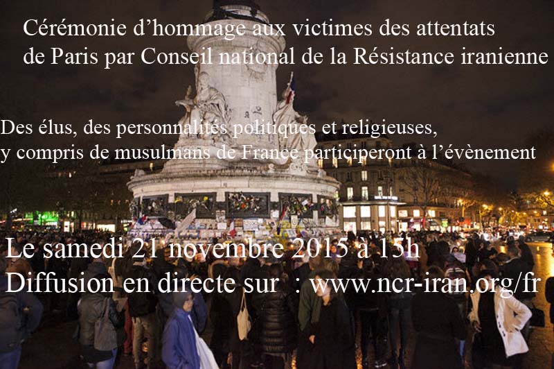 Le Conseil national de la Résistance iranienne tiendra le 13 novembre 2015 une cérémonie d’hommage aux victimes des attentats de Paris. Des élus, des personnalités politiques et religieuses, ainsi que des dirigeants musulmans de France participeront à l’événement.