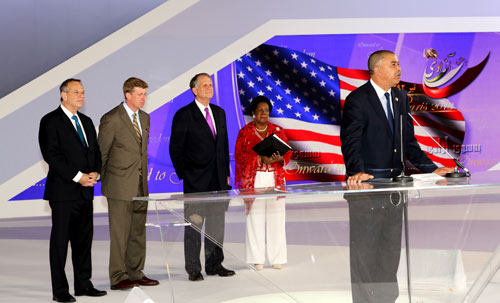 Ce mois-ci, nous savons qu’il y a eu des élections en Iran, mais l’élection d’un nouveau président du régime actuel ne change rien. Nous continuerons d’espérer que le changement est possible, mais soyons clair. Les États-Unis ne jugeront pas l’Iran par ses paroles récentes moins incisives ou par un nouveau visage bienveillant. Nous jugerons l’Iran par ses actes et nous jugerons l’Iran par le fait qu’il mettra fin à son aide militaire au régime syrien violent, nous jugerons l’Iran par le fait qu’il mettra fin à son soutien actif aux organisations terroristes dans le monde. Nous jugerons l’Iran par le fait qu’il mettra fin à sa répression brutale et violente de toute forme d’opposition politique.