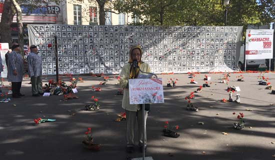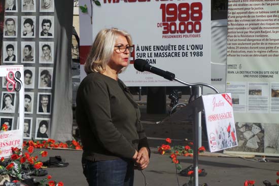 Hélène Fathpour, membre de la commission des Femmes du CNRI, a lu des témoignages des rescapés de la répression ou des familles des victimes : Je m’appelle Farzaneh Majidi et je téléphone de Londres. Cinq membres de ma famille ont été exécutés par les mollahs, dont deux tantes, Mehranguiz et Soheila Mohammad-Rahimi, en 1988. Soheila avait 18 ans lors de son arrestation et Mehranguiz 22 ans. Quand elles ont été exécutées, ma grand-mère était aussi en prison. »