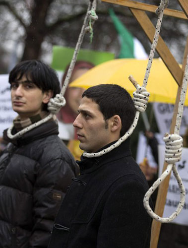 Les manifestants ont organisé une fausse pendaison durant leur manifestation à l’extérieur du Conseil allemand des relations étrangères à Berlin, ce 4 février , où le ministre des Affaires étrangères du régime iranien, Ali Akbar Salehi, intervenait.