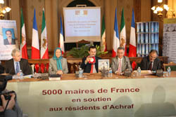 Les maires présents à la conférence se sont joints à l’appel lancé par Mme Maryam Radjavi, présidente élue du Conseil national de la Résistance iranienne, pour faire lever le blocus d’Achraf. Mme Radjavi a souligné « Cela fait dix mois que des agents venus d’Iran menacent jour et nuit avec une centaine de haut parleurs très puissants les habitants d’Achraf d’attaques, de mort et d’incendie pour maintenir des tortures psychologiques permanentes. Certains haut-parleurs sont à dix mètres des lieux de résidences ou de la clinique d’Achraf. » « Il faut protéger ceux qui ont payé le plus lourd tribut et qui se trouvent au premier rang de la lutte contre l’intégrisme religieux, à savoir les habitants courageux d’Achraf », a-t-elle conclu.