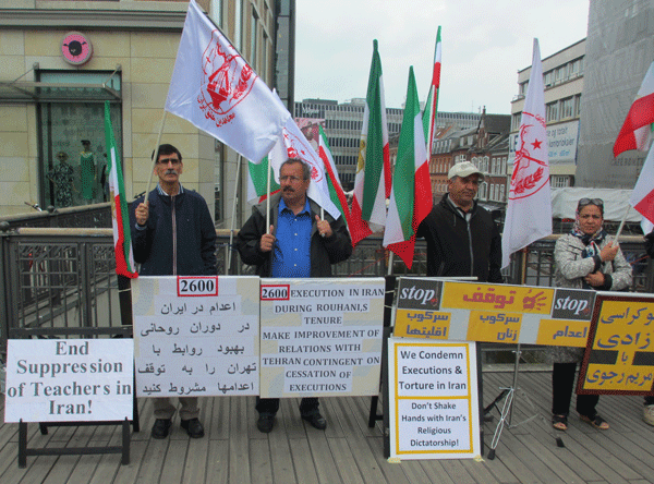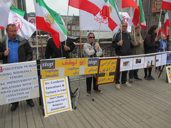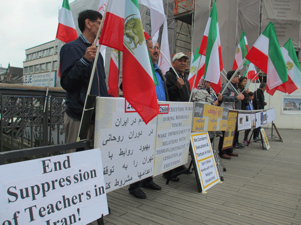 Une de leurs banderoles exhortait les représentants Européens à « Améliorer les relations avec le contingent de Téhéran en ce qui concerne la suspension des exécutions. »
