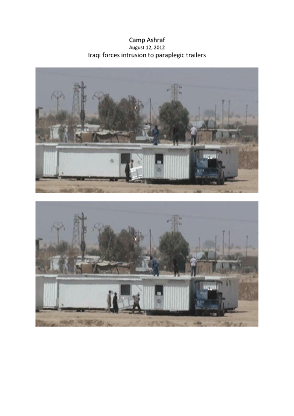 Comme les Irakiens avaient assuré la MANUI qu’ils entoureraient les bungalows de barbelés pour que personne ne puisse y pénétrer, les observateurs de l’ONU ont quitté le camp d’Achraf le 11 aout. Immédiatement, les forces irakiennes avec des officiers du renseignement sous les ordres du lieutenant Haidar, dans une claire violation de leur accord avec la MANUI, sont entrés dans les bungalows avec des perceuses et d’autres équipements et se sont mis à y faire des travaux suspects (Photos jointes).