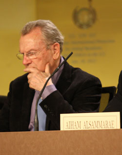 Je suis à la fois très heureux et un peu peiné de la présence de nos collègues et amis américains aujourd’hui dans cette conférence. Je suis très heureux parce que c’est toujours très agréable de recevoir de vieux complices avec lesquels nous n’avons pas échangé quand même beaucoup de boulets de canon, nous n’avons eu qu’une seule bataille navale contre les États-Unis, je ne sais même pas qui l’a gagnée. Mais un petit peu peiné parce que leur présence signifie malheureusement que la pression demeure sur Achraf et qu’il faut décidément lourdement insister, nous mobiliser, et la guerre ne se gagne que dans la durée, contre les injustices, l’oppression et l’impuissance,