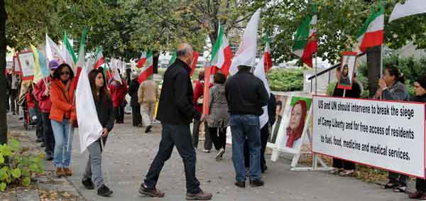 Les manifestants parmi lesquels il y avait des membres des familles de dissidents iraniens résidant au camp Liberty en Irak ont appelé l’ONU et les Etats-Unis à agir pour protéger les résidents de ce camp et pour leur permettre d’accéder aux soins médicaux.