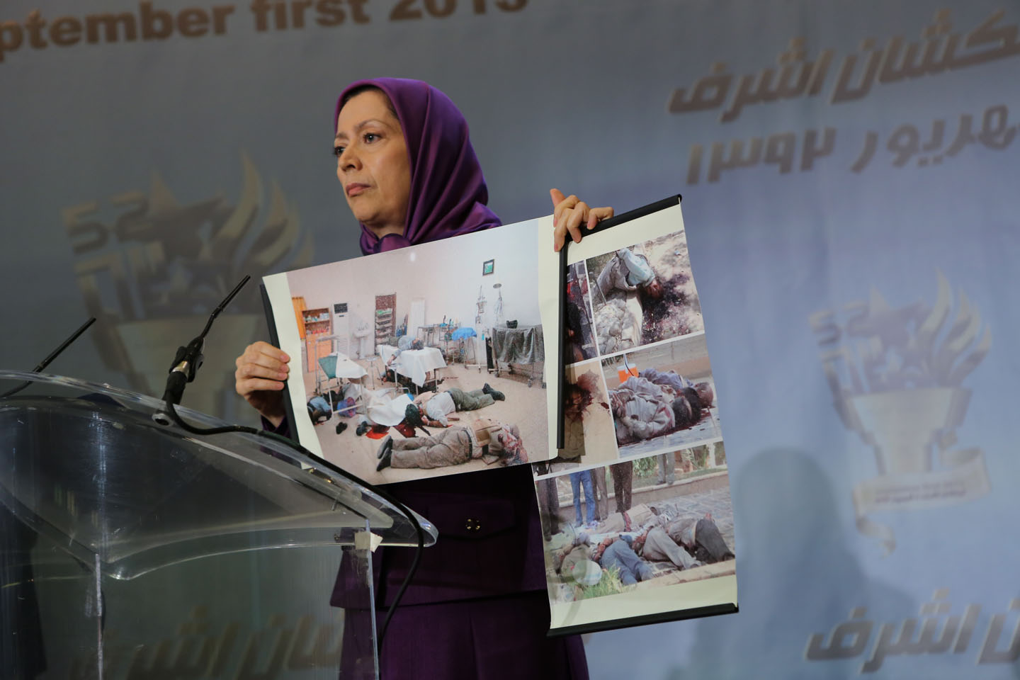 Maryam Radjavi : « Les Etats-Unis avaient garanti par écrit la sécurité et la protection de ces personnes. L’ONU et Mme Pillay ont une responsabilité dans la protection de ces personnes. Ces sept personnes, comme les 52 autres massacrées le 1er septembre étaient restées à Achraf avec l’accord écrit des Etats-Unis et de l’ONU. D’ici j’appelle le secrétaire général de l’ONU à ne pas garder le silence et à demander au 1er ministre irakien de libérer immédiatement les otages. »