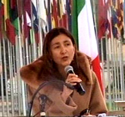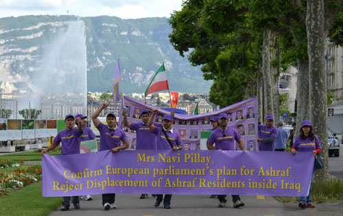 Sous une pluie battante, elle venait soutenir les manifestants qui entrent dans la troisième année de sit-in devant l’ONU et le HCR pour obtenir la protection des opposants iraniens dans les camps d’Achraf et de Liberty en Irak. Le plus longs sit-in de l’histoire de Genève. Voici les temps forts de son intervention :
