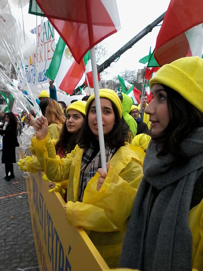 La manifestation se met en marche au son des tambours et des slogans. Le message “Non à Rouhani” est omniprésent, sur les pancartes, ballons, t-shirts, etc. De nombreuses pancartes affichent le visage de Maryam Rajavi, en symbole de la résistance.