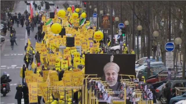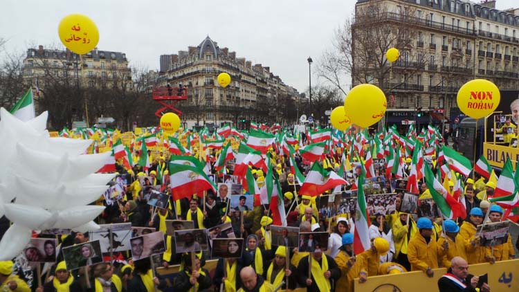 Les milliers de manifestants qui brandissent des pancartes jaunes et d’autres aux couleurs du drapeau iranien sur la place historique de Denfert-Rochereau, dans le centre de Paris, demandent l’arrêt des exécutions en Iran. On peut lire sur leurs pancartes : « Non à Rohani ».