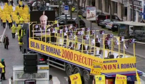 Appel aux français pour soutenir la lutte pour la démocratie et la liberté. Le bus est orné de photos de victimes d’éxécutions suspendues à des cordes pour symboliser les pendaisons. La manifestation peut être commentée et suivie sur Twitter #No2Rouhani