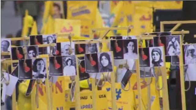 L’historique place de Denfert-Rochereau au centre ville de Paris est peuplée de milliers de personnes avec des pancartes jaunes et drapeaux iraniens à trois couleurs afin d’éxiger la fin des éxécutions en Iran. Leurs pancartes disent : « Non à Rouhani. »