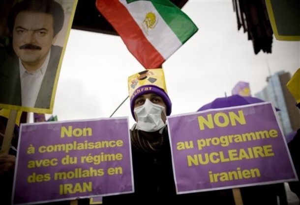 AP , 6 décembre – Un membre de l’opposition iranienne portant un masque manifeste avec des posters disant « non à la complaisance avec le régime des mollahs en Iran » et « non au programme nucléaire iranien » devant l’ONU à Genève lundi 6 décembre.
