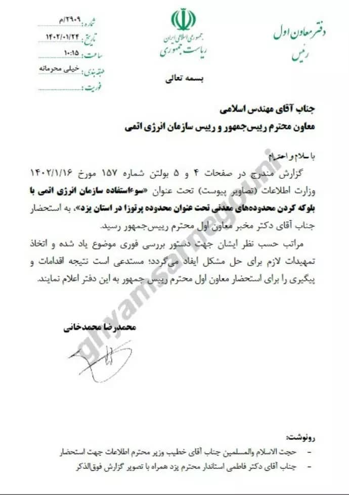 Le rapport mentionné aux pages 4 et 5 du bulletin n° 157 daté du 5 avril 2023 du ministère du Renseignement (images jointes), intitulé » Utilisation abusive de l’Organisation de l’énergie atomique en bloquant les zones minières sous prétexte de zones radioactives dans la province de Yazd « , a attiré l’attention de M. Mokhber, l’estimé vice-président.