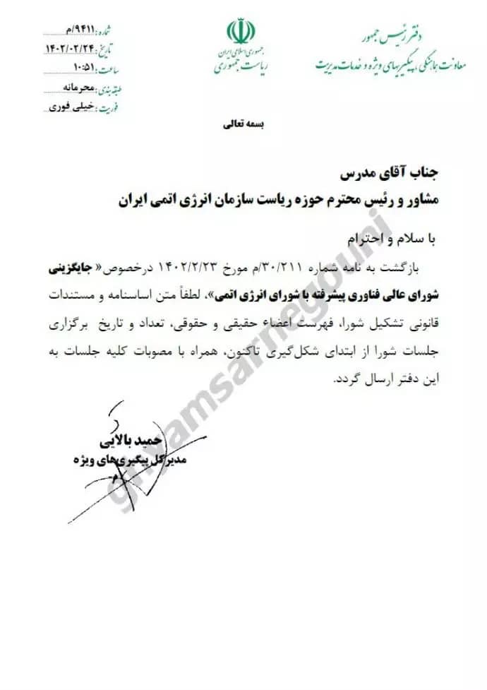 Eslami, adjoint du président et chef de l’Organisation de l’énergie atomique d’Iran, pour référence à la lettre mentionnée dans le texte, pour information.