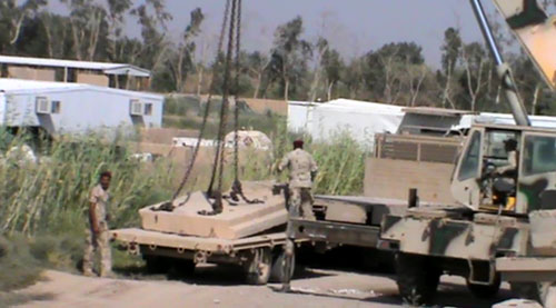 Le 30 décembre 2013, les forces irakiennes aux ordres des services du Premier ministre ont commencé à transférer les murs de protection en T qui étaient entassés derrière les murs du camp Liberty, hors de ce secteur. Ces murs en T sont chargés dans des véhicules spéciaux et emmenés vers le sud et l’est du camp. Cette décision survient quatre jours à peine après la quatrième attaque à la roquette sur le camp, qui rend doublement nécessaire des mesures de protection.