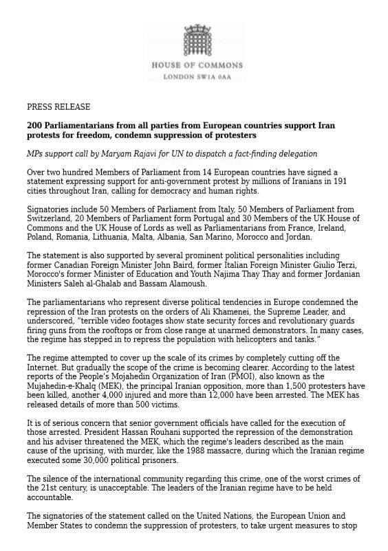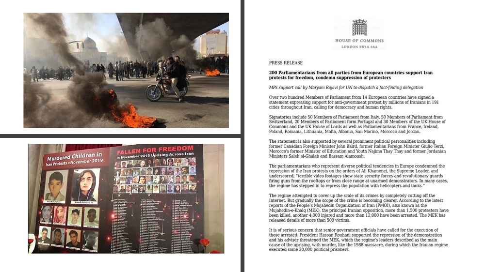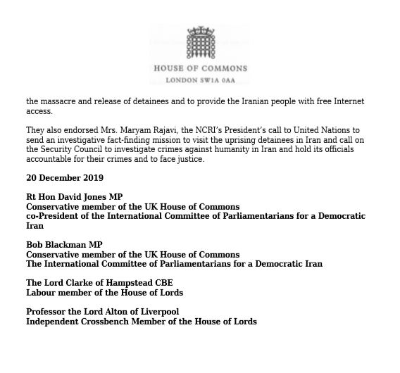 Vendredi 20 décembre 2019, quatre législateurs britanniques ont annoncé dans un communiqué de presse : « Plus de deux cents eurodéputés de 14 pays ont signé une déclaration exprimant leur soutien aux millions d’Iraniens qui ont manifesté dans 191 villes d’Iran pour réclamer la démocratie et les droits de l’homme. «