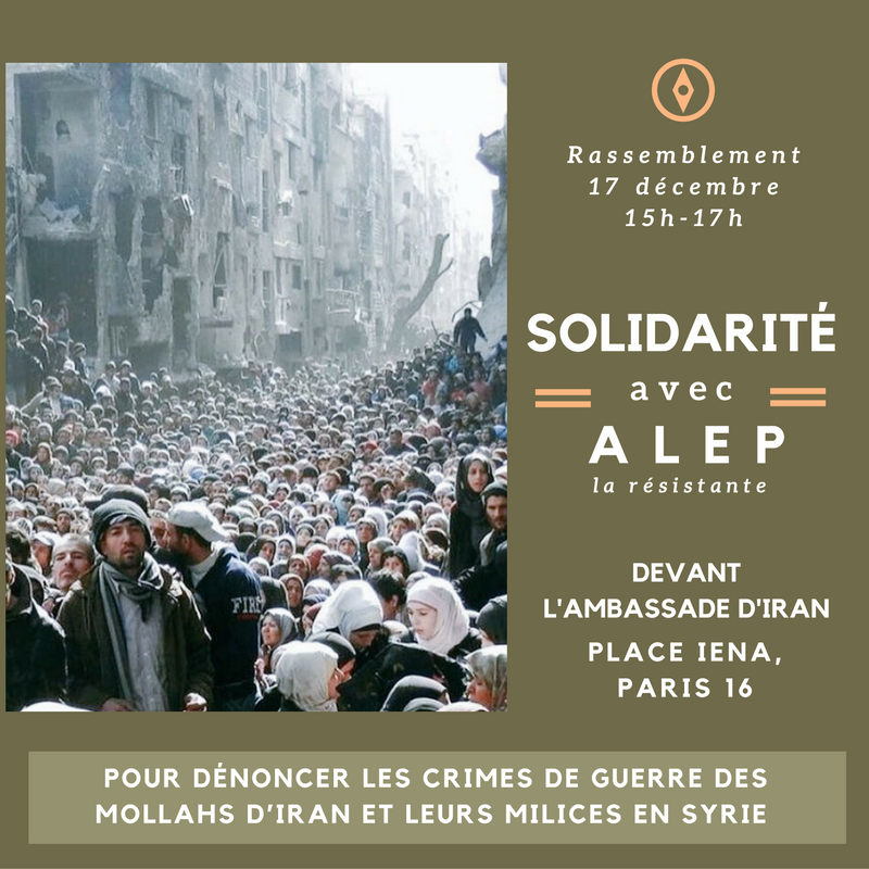 Un rassemblement aura lieu samedi 17 décembre devant l’ambassade d’Iran à l’appel de « la révolution Syrienne en France » pour protester contre le rôle criminel du régime iranien dans le carnage d’Alep.