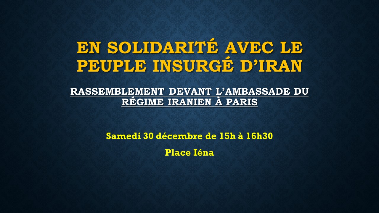 A Paris un rassemblement aura lieu aujourd’hui, à proximité de l’ambassade du régime iranien, Place Iéna, de 15h à 16h30, en solidarité avec les manifestations annoncées dans une centaine de villes ce samedi en Iran.