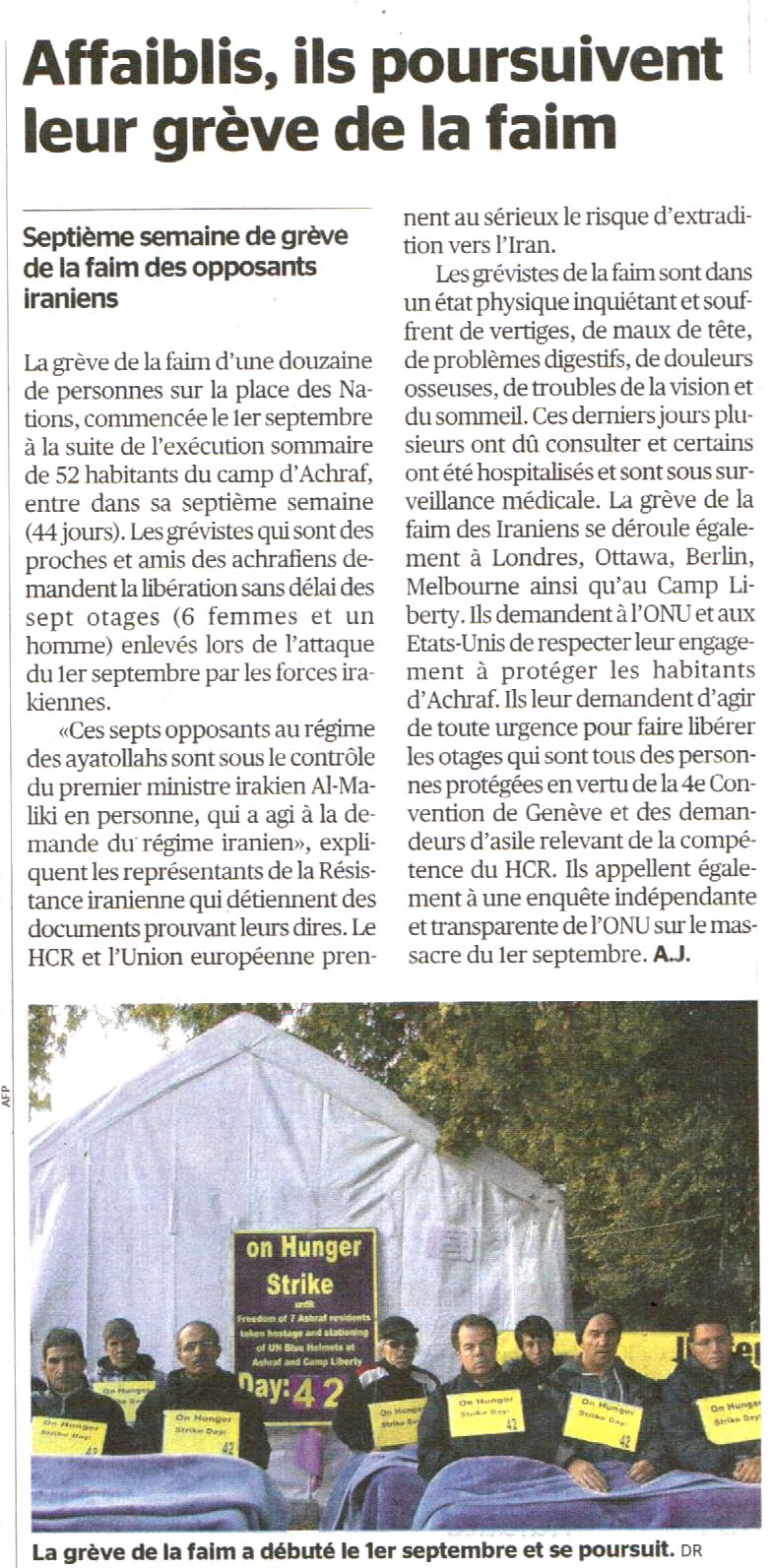 14 oct. 2013 – Tribune De Geneve – A.J. – La grève de la faim d’une douzaine de personnes sur la place des Nations, commencée le 1er septembre à la suite de l’exécution sommaire de 52 habitants du camp d’Achraf, entre dans sa septième semaine (44 jours). Les grévistes qui sont des proches et amis des achrafiens demandent la libération sans délai des sept otages (6 f emmes et un homme) enlevés lors de l’attaque du 1er septembre par les forces irakiennes.