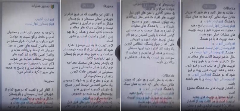 La directive de la cyber armée du régime donne les instructions suivantes à ses agents : «En raison du nombre élevé de fausses informations et de contenus qui contredisent la réalité des récents incidents à Saravan et des activités de truands armés sous prétexte de partisans de fausses victimes à la frontière de Saravan [avec le Pakistan] soutenus par les groupes d’opposition, il est crucial de suivre la directive suivante : 1- Imposer l’idée qu’il n’y a pas de protestations dans la province du Sistan-Baloutchistan et les prétentions des groupes d’opposition sont fausses et sont destinées à perturber la paix et la sécurité dans la province et dans le pays. 2- Sur Twitter, faites référence au fait qu’il y a une différence entre les voyous et la population du Balouchistan, et nous ne laisserons pas les Baloutches seuls. 3- Republier largement les textes et les affiches concernant les incidents au Sistan-Baloutchistan. 4- Ne retweetez pas et ne suivez pas les messages des opposants qui répandent des rumeurs. »