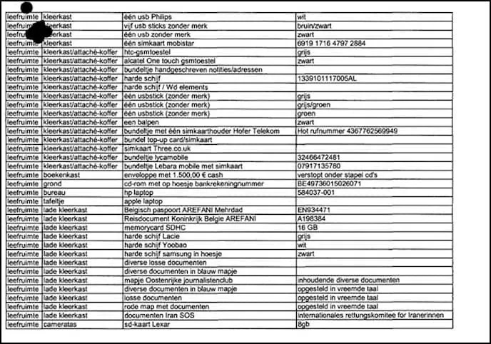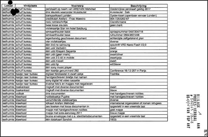 Lors de l’inspection de la maison d’Arefani, une collection d’appareils et d’équipements d’espionnage, toutes sortes d’enregistreurs USB, des caméras infiltrées, des ordinateurs, différents types de téléphones mobiles, diverses cartes SIM, des disques durs externes contenant les informations collectées auprès de l’opposition ont été trouvés. Il est donc clair qu’Arefani était occupé à faire de l’espionnage et collecter des renseignements.