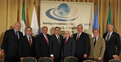 Figuraient au panel le procureur général Michael Mukasey, le ministre de l’Energie Spencer Abraham, le gouverneur de Pennsylvanie Ed Rendell, le commandant du Corps des Marines le général James Conway, le commandant adjoint des Etats Unis pour l’Europe Charles Wald, l’ambassadeur John Bolton et le directeur du FBI Louis Freeh. Le maintien de l’inscription de l’OMPI [sur la liste noire] sert de permis pour un génocide au camp d’Achraf, en Irak ont déclaré ces autorités.