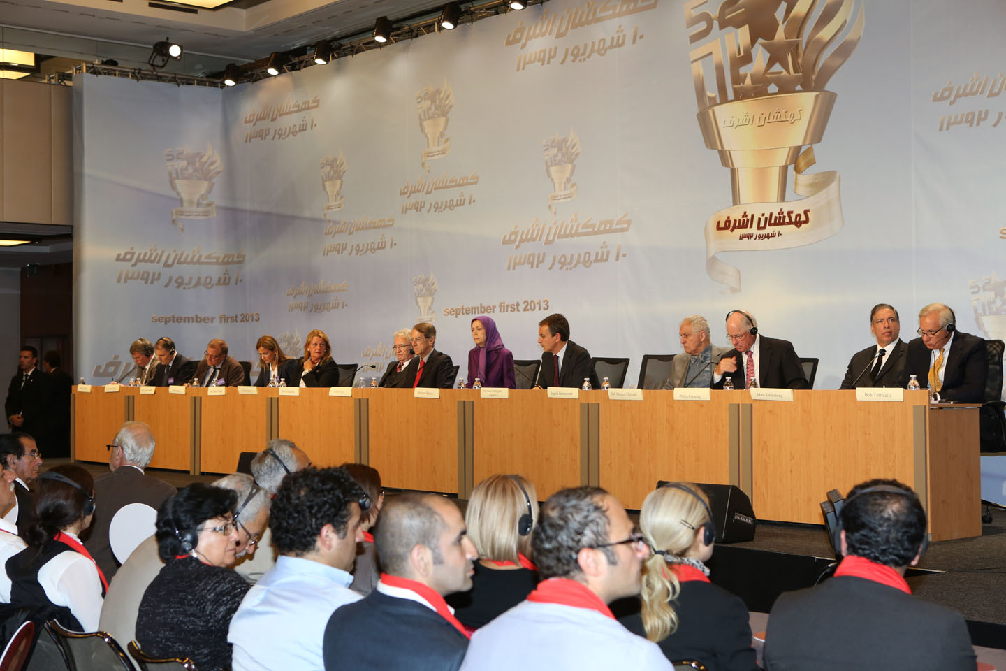 Dans cette conférence, figuraient au nombre des intervenants, outre Mme Radjavi, José-Luis Rodriguez Zapatero, ancien premier ministre espagnol, Giulio Terzi, ancien ministre italien des Affaires étrangères (2011, 2013), Horst Telchik, président de la conférence sur la sécurité de Munich (1999-2008), Sid Ahmed Ghozali, ancien premier ministre algérien, Philip Crowley, ancien porte-parole du Département d’Etat américain (2009-2011), Ingrid Betancourt, le députés suisses Eric Voruz, le député italien Alessandro Pagano, les sénateurs espagnols Margarita Duran et Ripol, la députée belge Els Demol, Tahar Boumedra, ancien directeur du bureau des droits de l’homme de la MANUI en Irak et responsable du dossier d’Achraf, Mark Grinsberg, ancien ambassadeur américain au Maroc, l’ancien sénateur américain Robert Torricelli, le colonel Mesghal Al-Batich, général d’état-major de l’Armée syrienne libre, le Dr Ferechteh Bolourchi, représentante du CNRI en Allemagne et mère de Rahman Mannani, tués dans le massacre d’Achraf le 1er septembre, le colonel Wesley Martin, commandant du dispositif américain de protection d’Achraf, et Nils De Dardel, avocat et président du Comité suisse de défense d’Achraf.