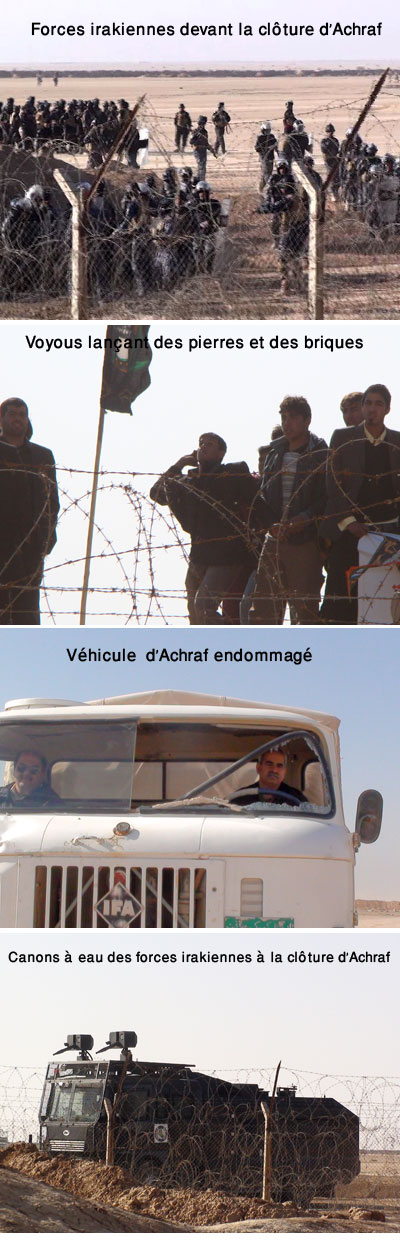 Les agents de cette bande se sont rassemblés dans l’aile Est d’Achraf à 11h00 (heure locale) et ont commencé à lancer des briques, des pierres et des bouts de bois qui ont cassé les vitres de plusieurs véhicules à l’intérieur du camp et endommagé les installations.