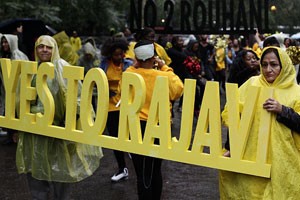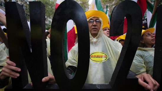 Brandissant des drapeaux iraniens et des posters des dirigeants de l’opposition, les manifestants, sympathisants de l’OMPI, ont souligné que Rohani devait rendre compte de la dégradation des droits de l’homme en Iran, de son soutien au régime criminel d’Assad et de son refus de continuer à coopérer avec la communauté internationale pour résoudre l’impasse nucléaire. Les Iraniens on averti qu’il ne fallait faire aucune concession au régime au régime des mollahs dans les négociations nucléaires et qu’il ne fallait pas le laisser profiter de la crise régional pour prolonger les négociations nucléaires ou obtenir des concessions pour préserver son programme d’armes atomiques.