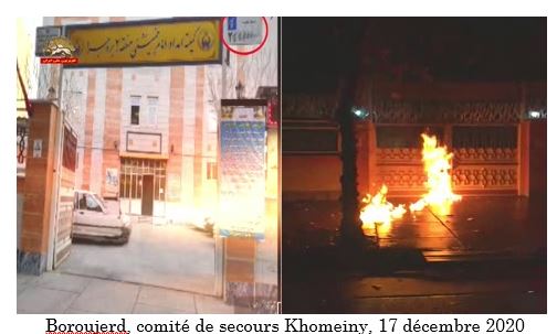 Le jeudi 17 décembre, en réponse à la destruction des maisons de personnes démunies à Dehloran et Tabriz, de jeunes insurgés ont pris pour cible le « Comité de secours Khomeiny » à Boroujerd et ont incendié son entrée. Ce comité est un centre de pillage et de prédation visant les personnes démunies.