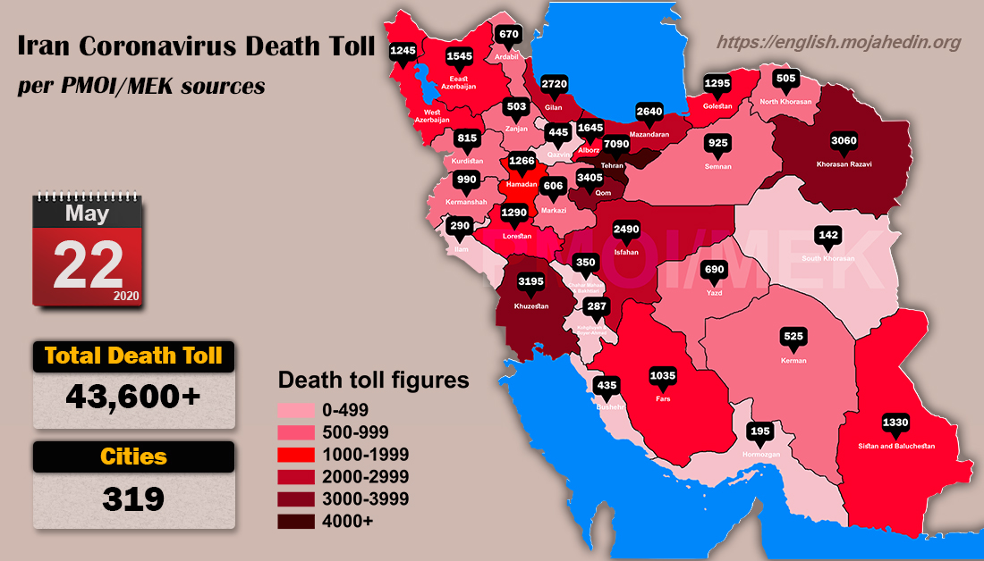 L’Organisation des Moudjahidine du peuple d’Iran (OMPI) a annoncé dans l’après-midi du 22 mai 2020 que le bilan des victimes du coronavirus dans 319 villes d’Iran a dépassé les 43 600. Le nombre de victimes dans les provinces de Khouzistan est de 3195, d’Azerbaïdjan de l’Est 1545, de Lorestan 1290, de Markazi 606, de Kerman 525 personnes et de Kohkilouyeh-Boyer-Ahmad 287. Le nombre de victimes à Téhéran a dépassé les 7090. Selon les rapports médicaux, au moins 220 personnes atteintes du coronavirus sont décédées dans le seul hôpital Labafi-Nejad de Téhéran.