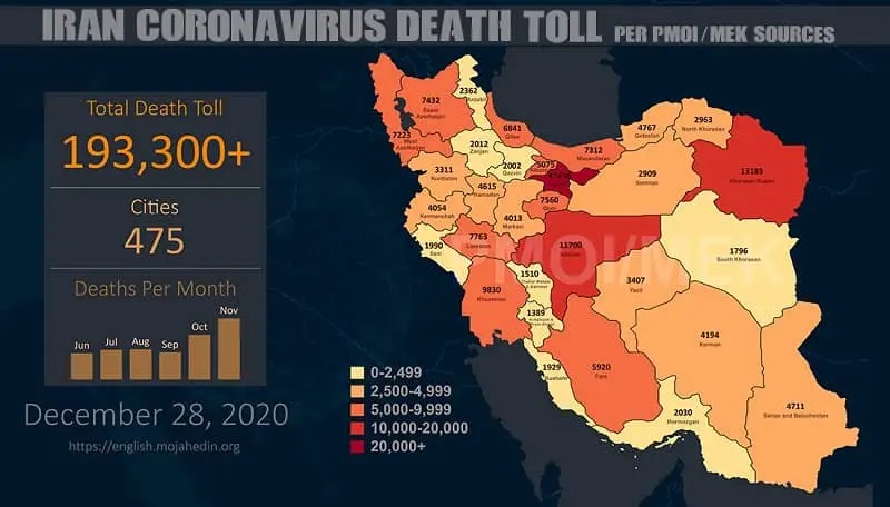 L’Organisation des Moudjahidine du peuple d’Iran (OMPI/MEK) a annoncé ce 28 décembre 2020 que le nombre de décès dus au coronavirus dans 475 villes d’Iran dépassait les 193 300.