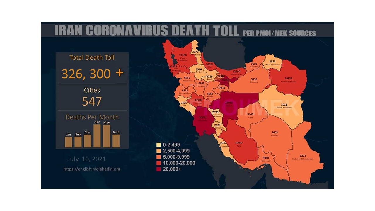 L’Organisation des Moudjahidine du peuple d’Iran (OMPI/MEK) a annoncé le 10 juillet 2021 que le nombre de décès dus au coronavirus dans 547 villes iranienne est de plus de 326.300.