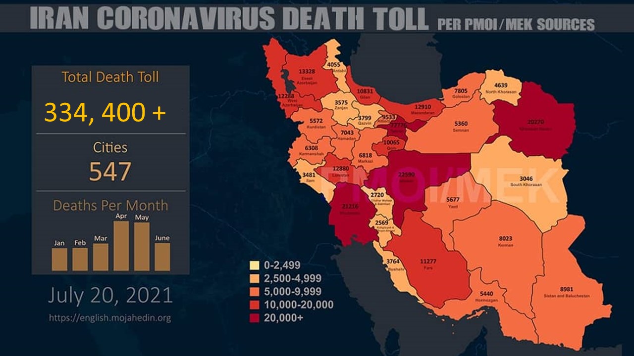 L’Organisation des Moudjahidine du peuple d’Iran (OMPI/MEK) a annoncé le 21 juillet 2021 que le nombre de décès dus au coronavirus dans 547 villes iraniennes est supérieur à 334.400.