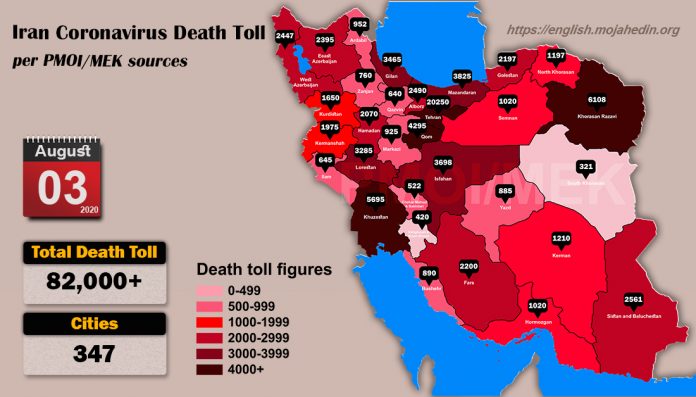 L’Organisation des Moudjahidine du peuple d’Iran (OMPI / MEK) a annoncé le 3 aout 2020, que le nombre de décès dus au coronavirus dans 347 villes d’Iran a malheureusement dépassé les 82.000. Le nombre de morts dans les provinces de Qom est de 4295, de Mazandaran 3825, de Guilan 3434, de Lorestan 3285, de Sistan-Baloutchistan 2561, d’Azerbaïdjan occidental 2447, d’Azerbaïdjan oriental 2395, de Fars 2200, de Golestan 2197, du Kurdistan 1650, de Hormozgan 1020, d’Ardebil 952 et de Markazi 925.