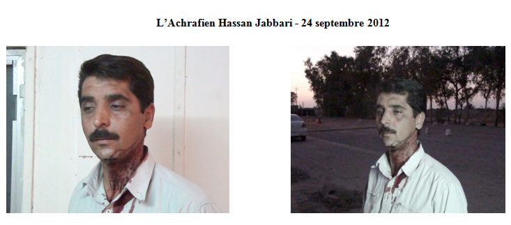 Dans les mois qui ont précédé le massacre à Achraf le 1 septembre 2013, Ghorban-Ali Hossein-Nejad avait contacté plusieurs fois les agents irakiens dans ce camp. Un communiqué du CNRI avait rapporté que cet individu le 23 septembre 2012, accompagné de 8 autres agents s’était rendu à Achraf. Lui et les agents irakiens avaient lancé des pierres sur les habitants, blessant l’un d’entre eux, Hassan Jabbari, à la nuque (voir les photos ci-jointes). Ce dernier figure au nombre des 52 Achrafiens assassinés lors du massacre du 1er septembre 2013.