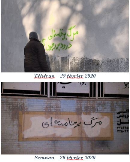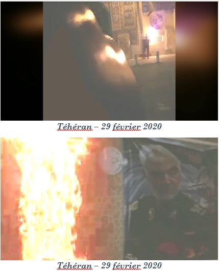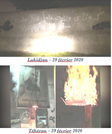Le samedi 29 février 2020, des jeunes rebelles ont mis le feu à des photos du guide suprême du régime, Ali Khamenei, et de Qassem Soleimani, commandant de la force terroriste Qods des pasdarans. Ils ont également couvert les murs de slogans contre le régime.